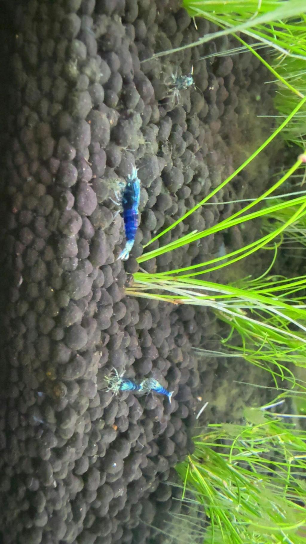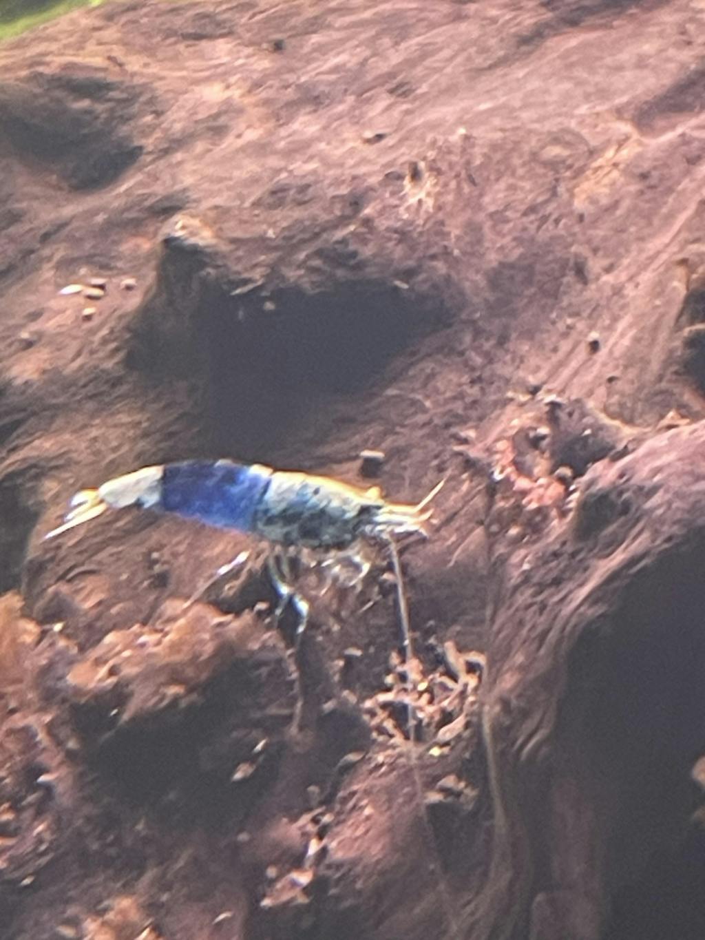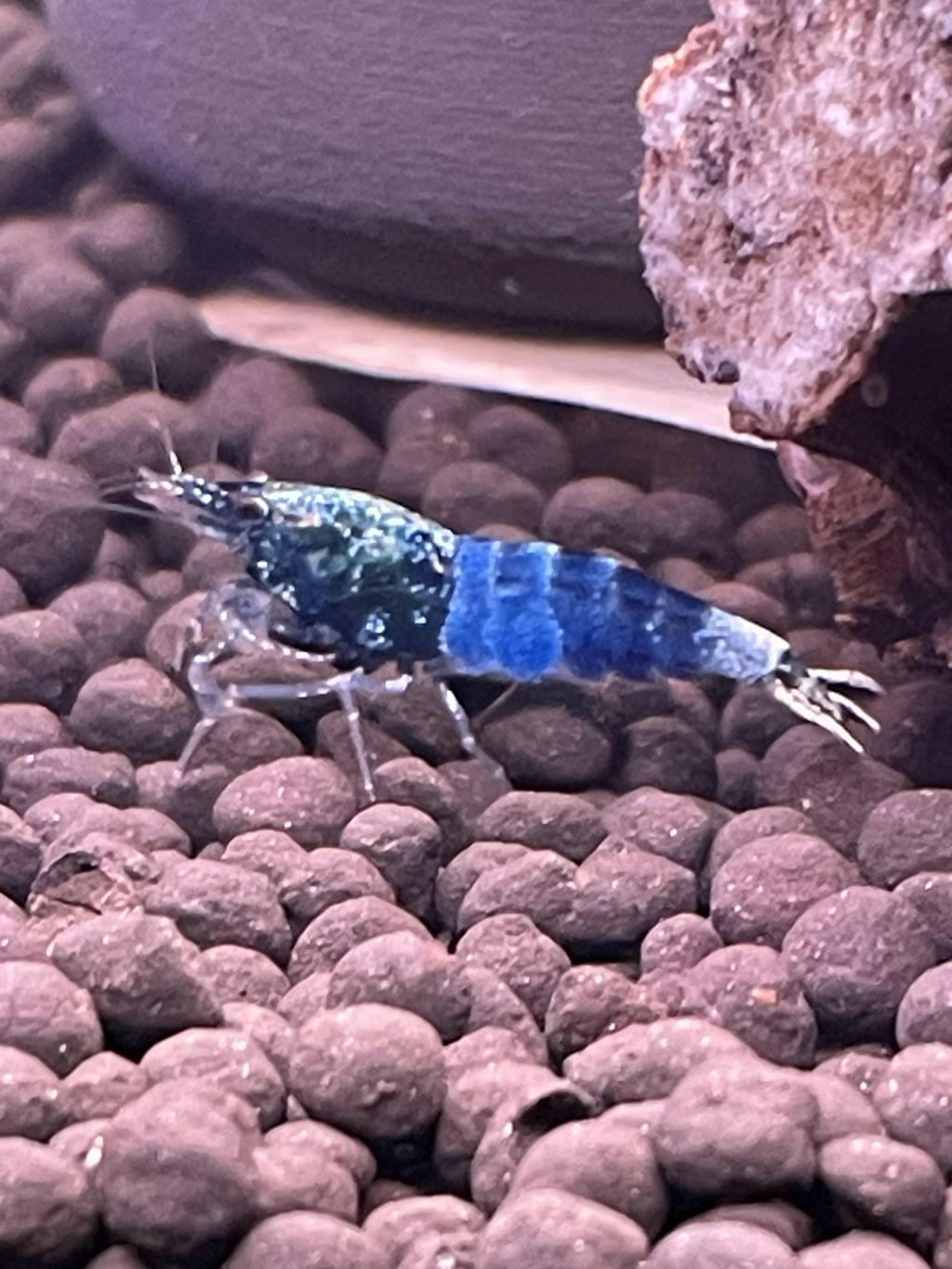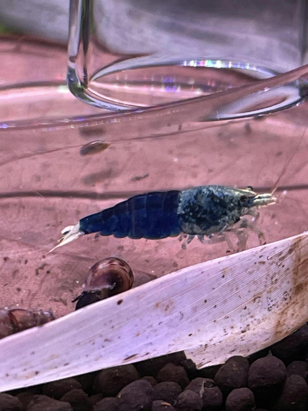 The Ocean Blue shrimp, a variety of Caridina Cantonesis, boasts a striking appearance with its royal blue midsection and head-to-tail Blue Bolt coloration.
