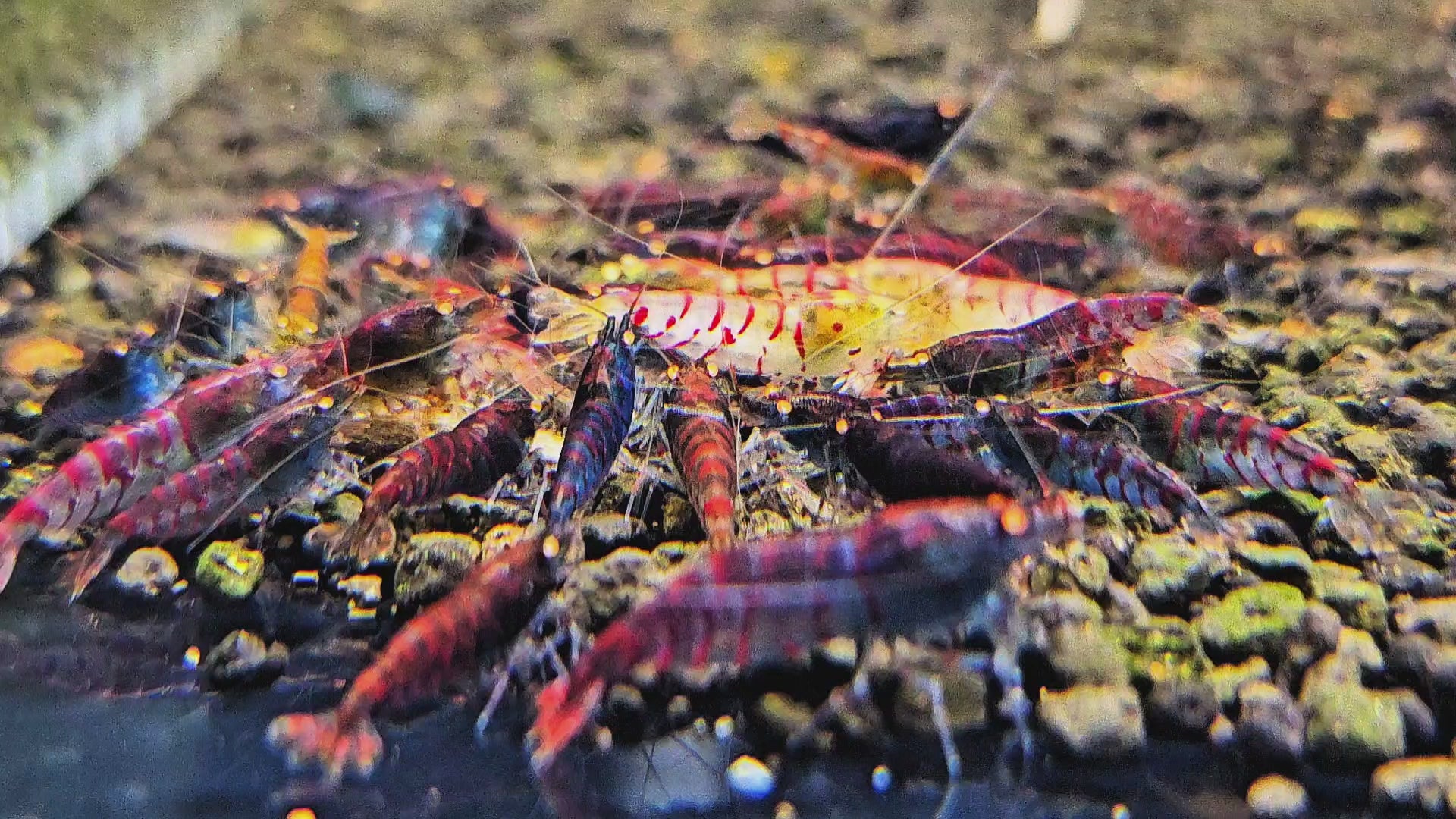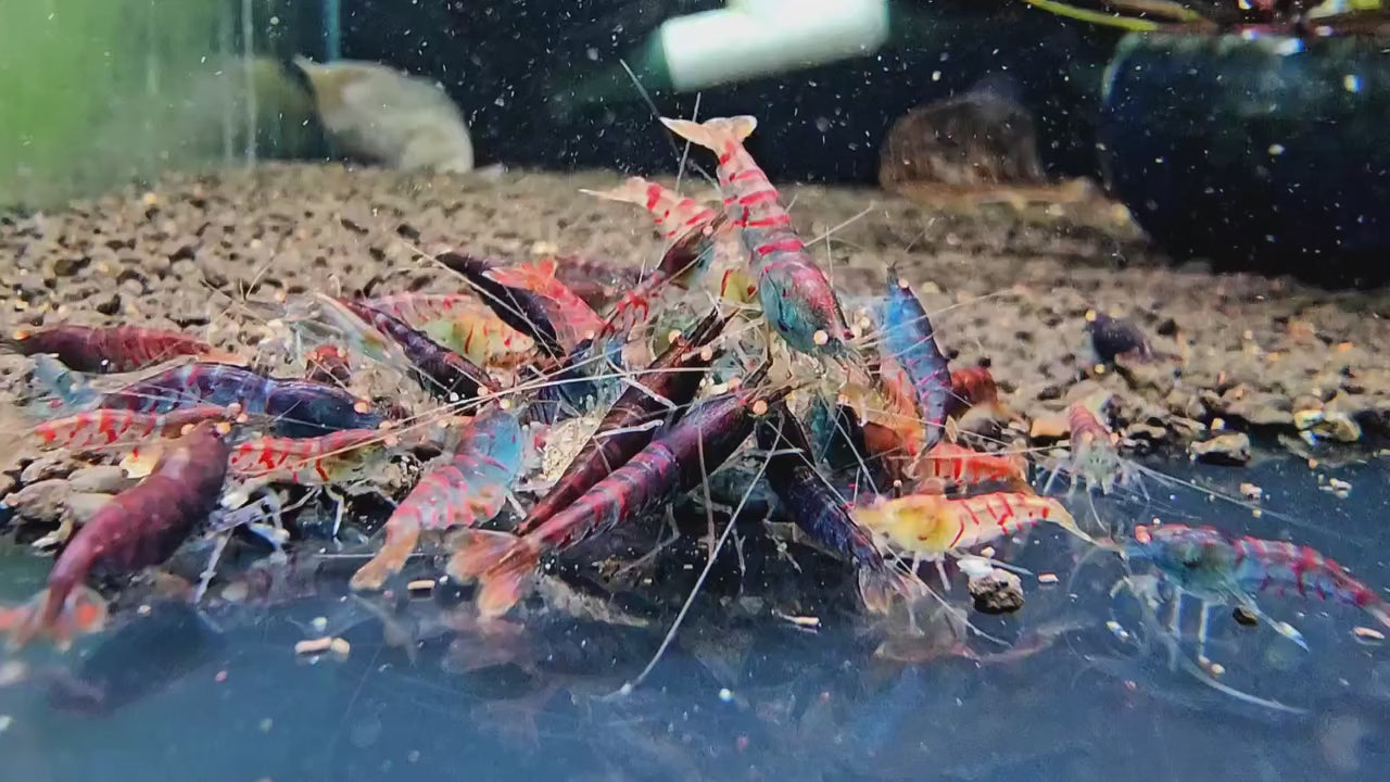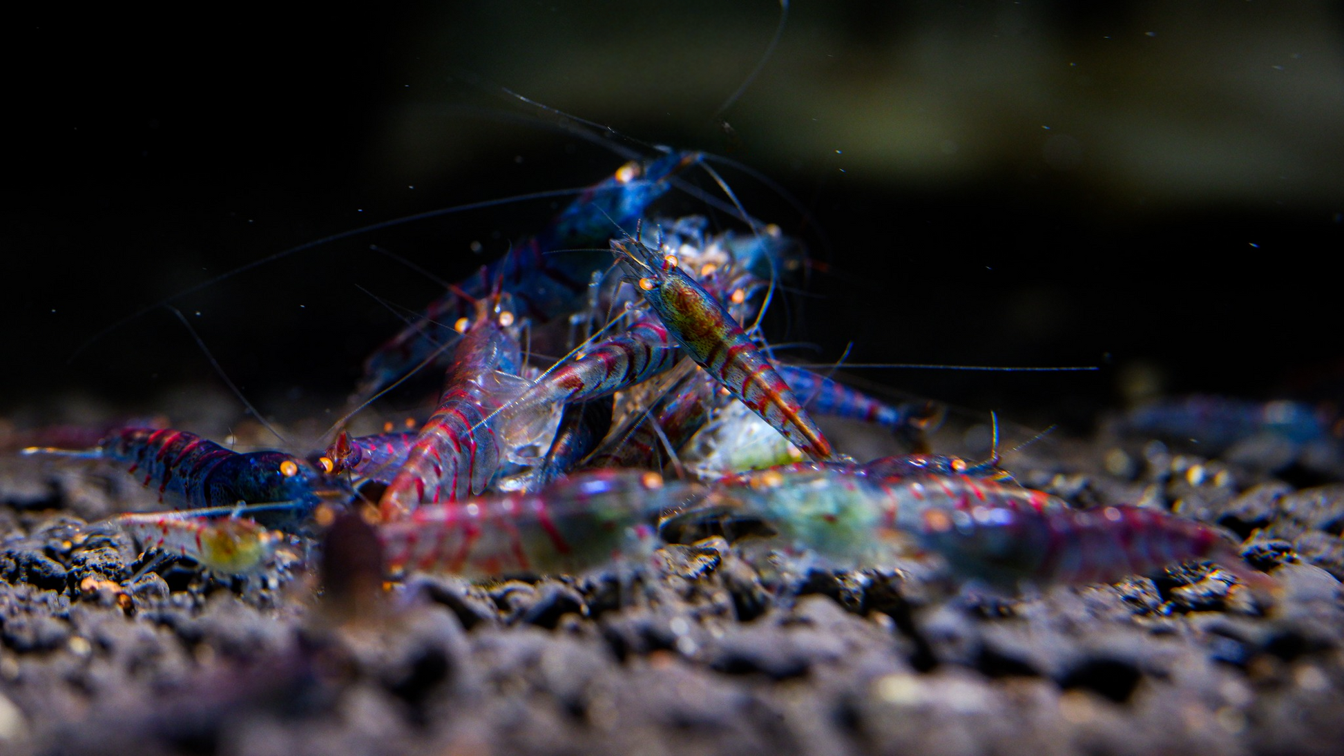 A rare variant of the orange eye shrimp, the orange eye red tiger blue body boasts a opaque blue body with a striking red tiger pattern.