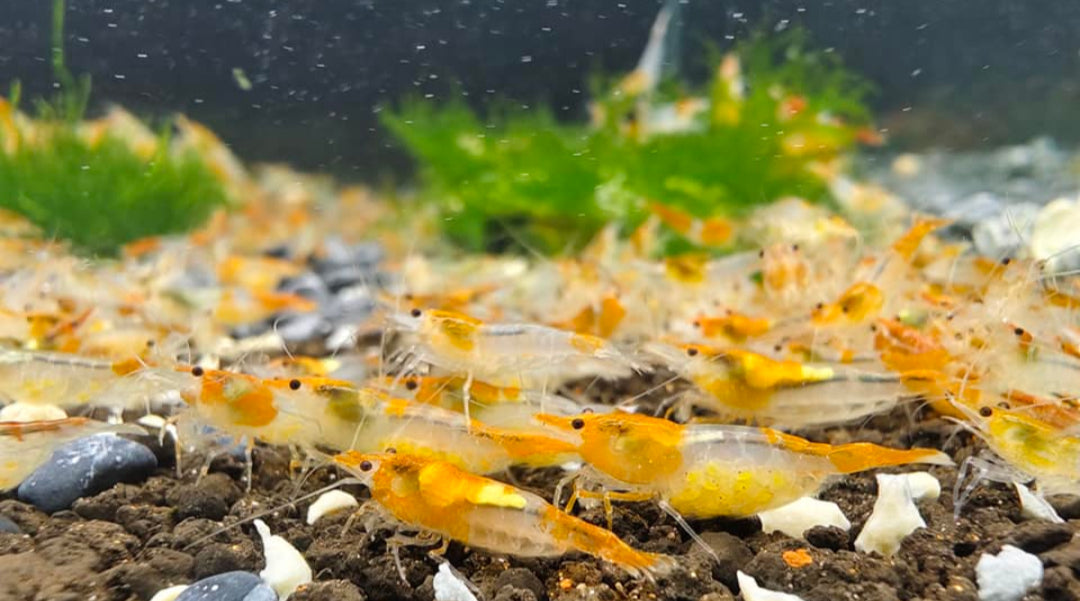 The Orange Rili Shrimp makes a striking and dynamic addition to a freshwater aquarium due to its beautiful orange and translucent white coloration, which stands out beautifully contrasted against a dark substrate.