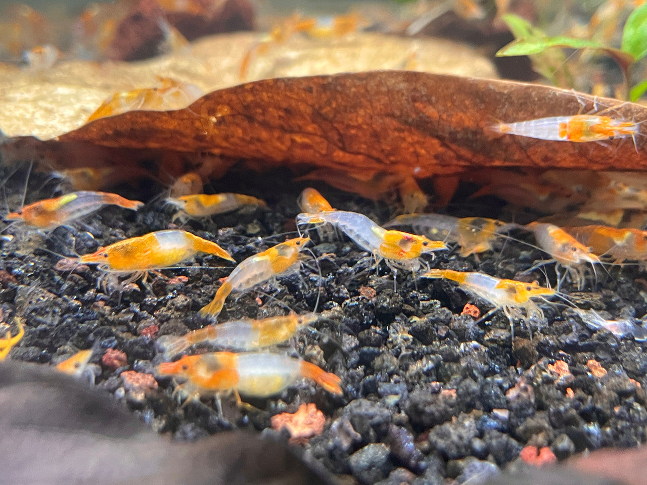 The Orange Rili Shrimp is a color variant of the Orange Sakura Shrimp. Orange Sakura Shrimp are a product of the selective breeding of the Red Cherry Shrimp for vibrant red and orange coloration. Orange Rili Shrimp were created by selecting for their bold translucent white and orange striping, and have become a very stable line. Orange Rili Shrimp are consistently bright orange with Translucent white striping. Typically the striping pattern is orange at the head and front part of the body with a translucent white stripe in the middle body and an orange tail. There can be variations depending on the breeding line.